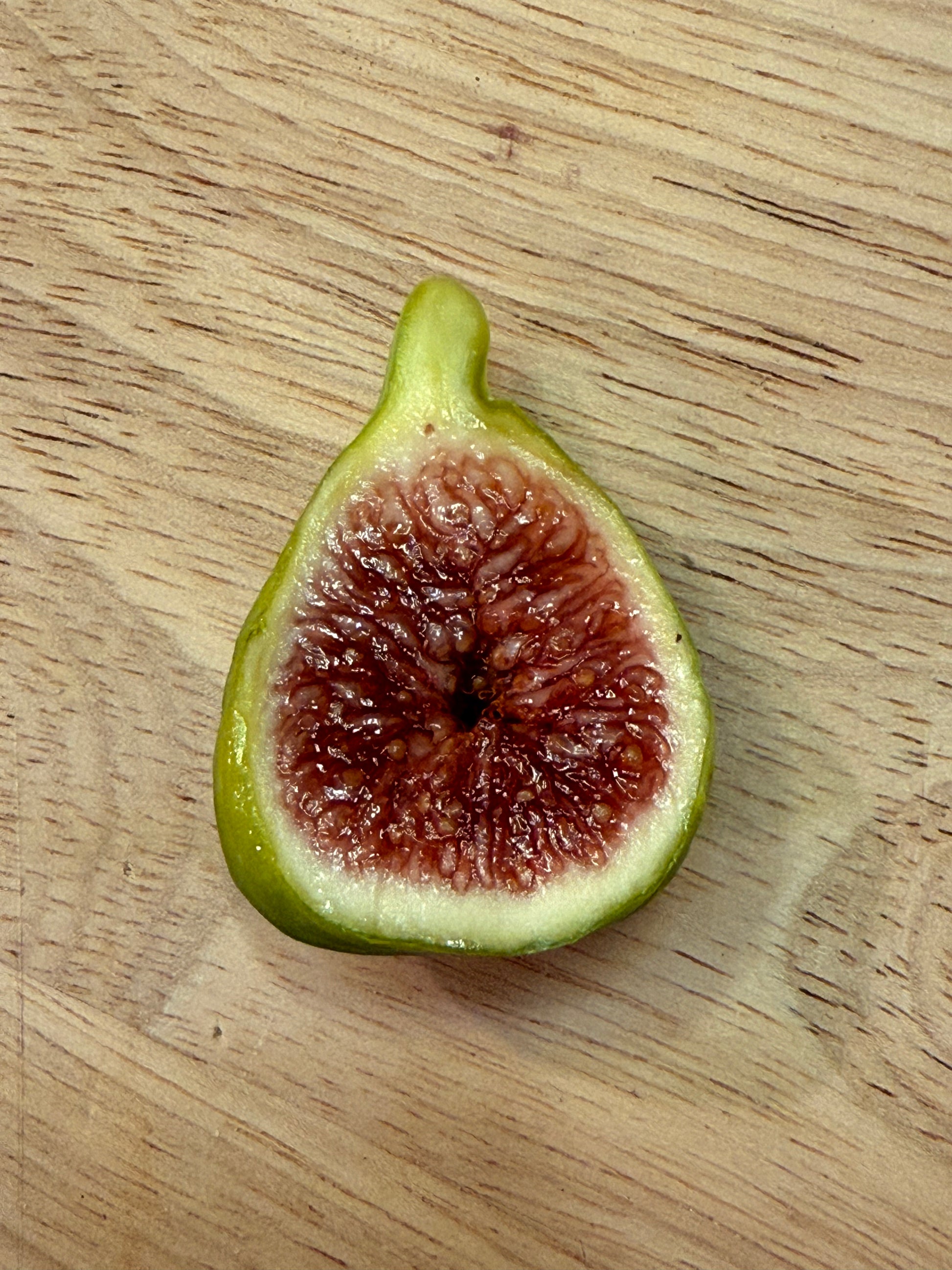 Sister Madeline's Green Greek (SMGG) is a self-fertile fig variety with green to yellow skin and deep red, juicy pulp known for its rich strawberry jam flavor and jammy, jelly-like texture. The fruit is medium to large in size, has a moderate seed crunch, and the tree features mostly five-lobed leaves.