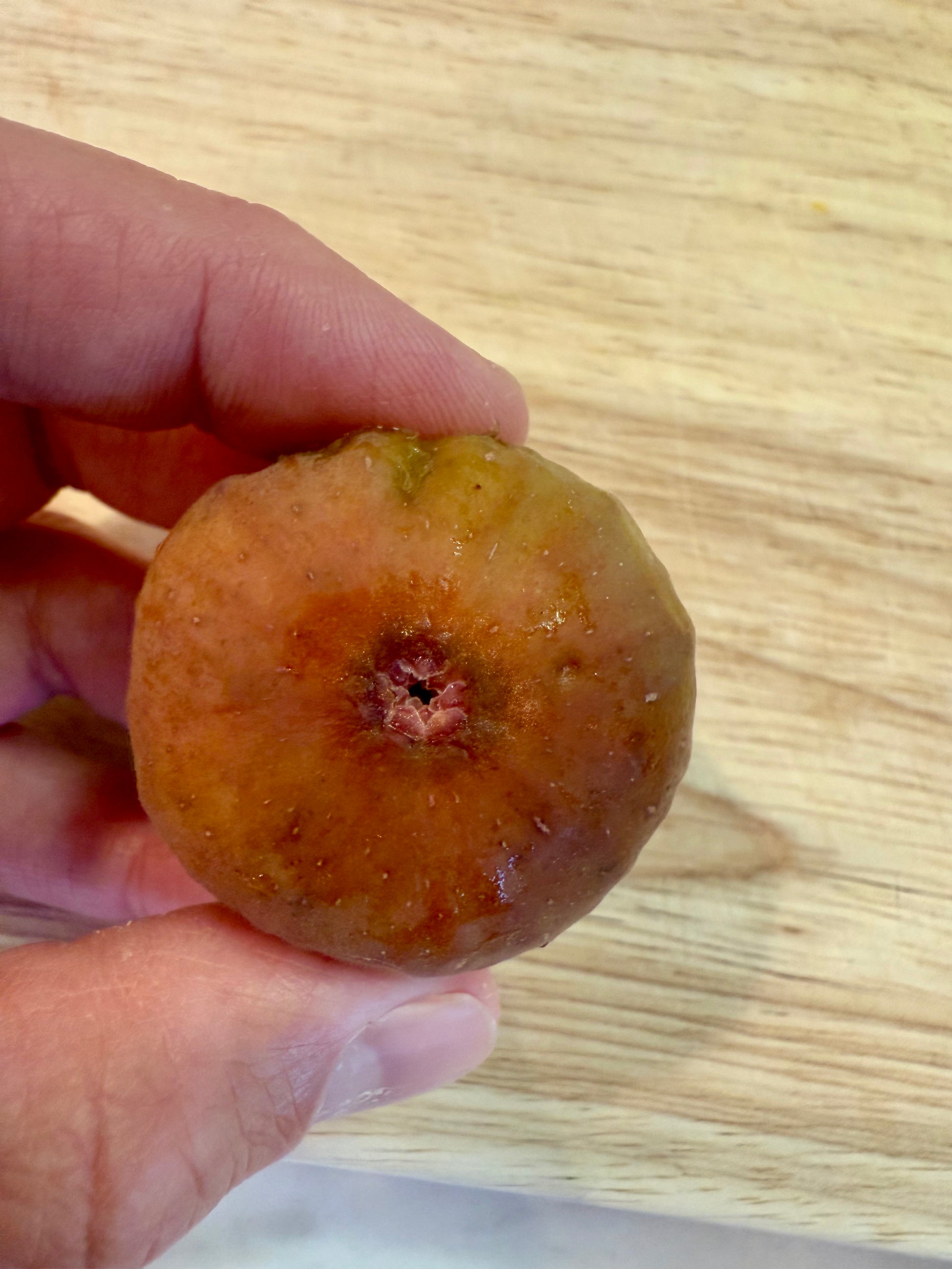 Wow! This fig is like dipping a perfectly ripe persimmon into a jar of honey - it’s so rich and sweet, it could be sliced and spread anywhere you’d use honey. It has a strong fuyu persimmon flavor. A unique pink/amber skin, with a golden flesh that reveals a spot of pink in the middle. Sweet like candy. Delicious!